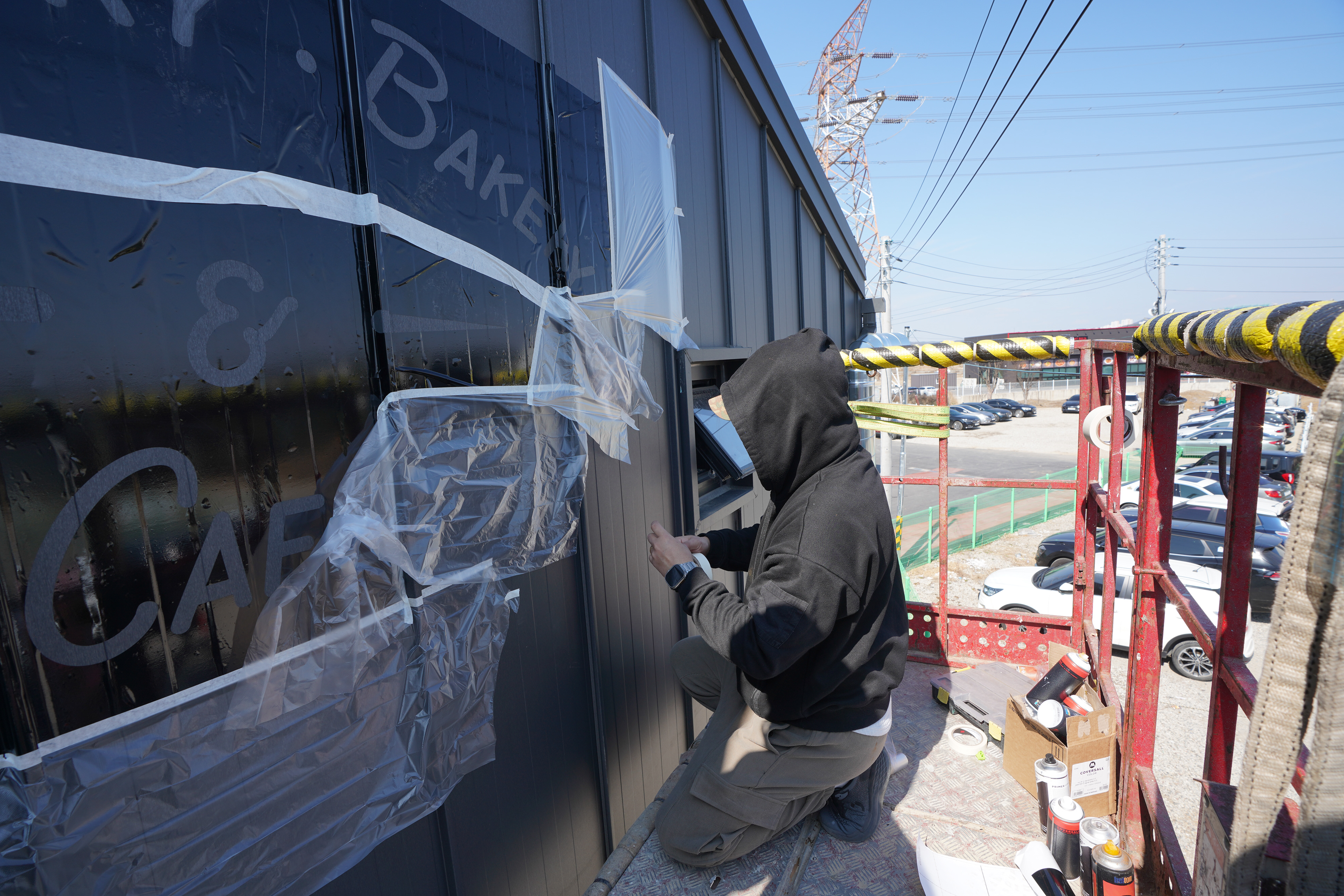 작업은 시트지 컷팅, 스텐실 세팅, 스프레이 마감의 순서로 진행되었으며, 그 이전 단계에서 표면 처리 공정이 핵심적으로 포함되었다. 새 징크판넬의 얇은 코팅막은 그대로 도장할 경우 추후 탈거 가능성이 있어, 사포 작업으로 표면 부착력을 확보한 뒤 Molotow Urban Fine-Art 라인의 스티로폼 프라이머를 도포해 도막의 안정성을 보강했다. 이 과정은 단순히 결과를 만드는 단계가 아니라, 결과가 오래 유지되기 위한 필수 조건이었다.