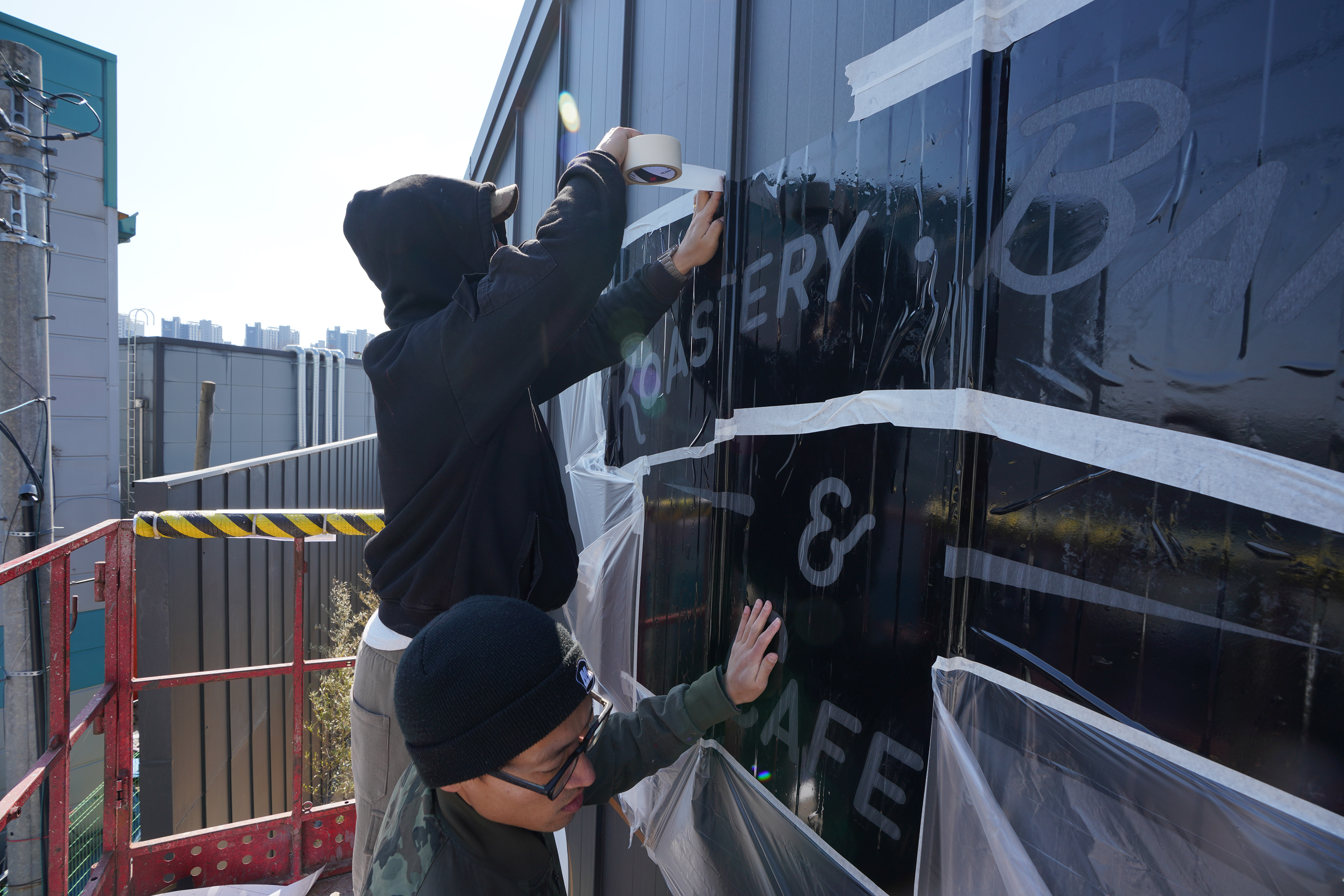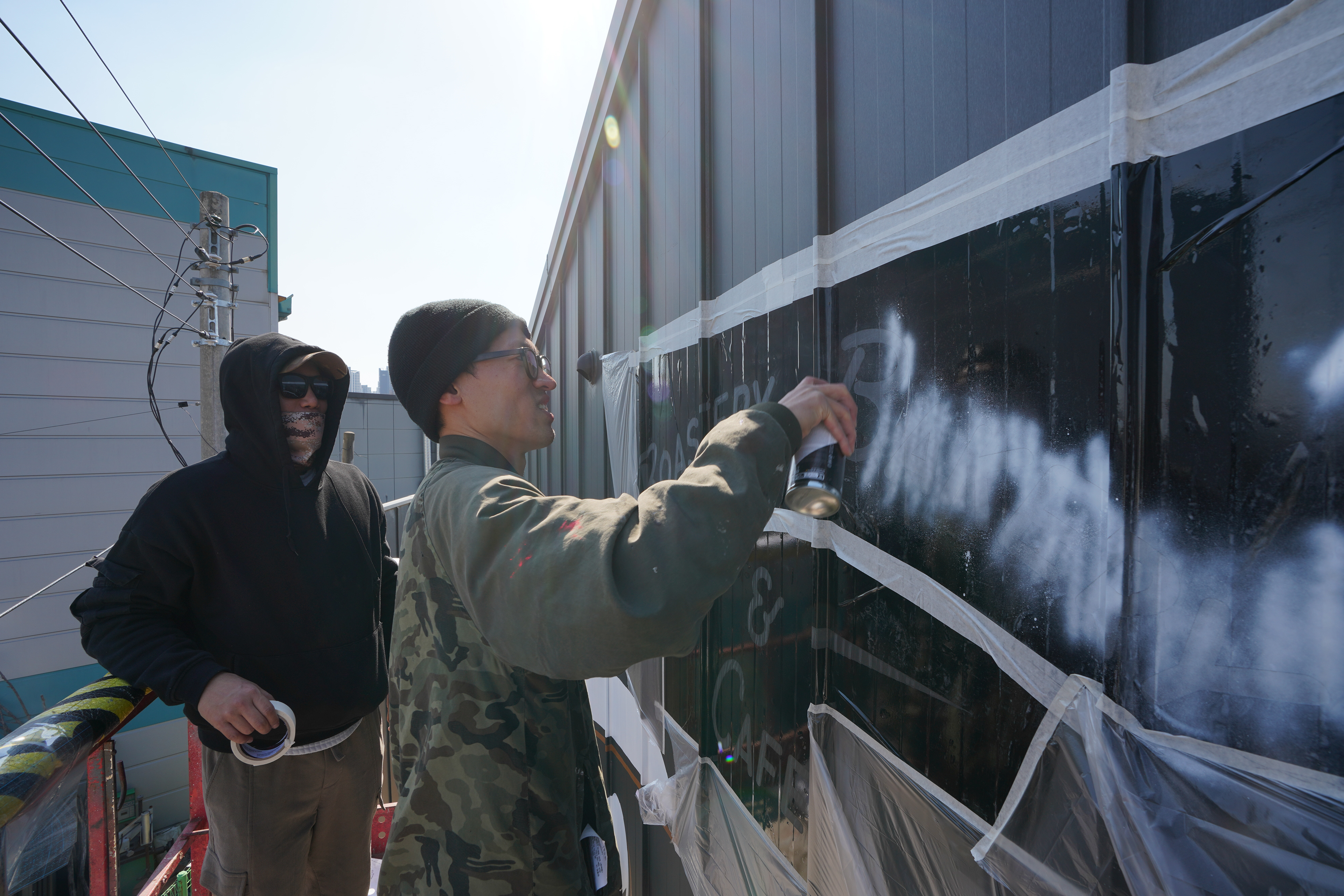The site was not an ideal flat surface due to flue elements on both sides and the overlapping structure of the zinc panels, which created ridges and irregularities. In particular, the panel seams required careful control when pressing the stencil into place. For that reason, this project was not simply about spraying onto a wall, but about separating and designing each process stage according to the surface condition in order to secure both precision and durability.