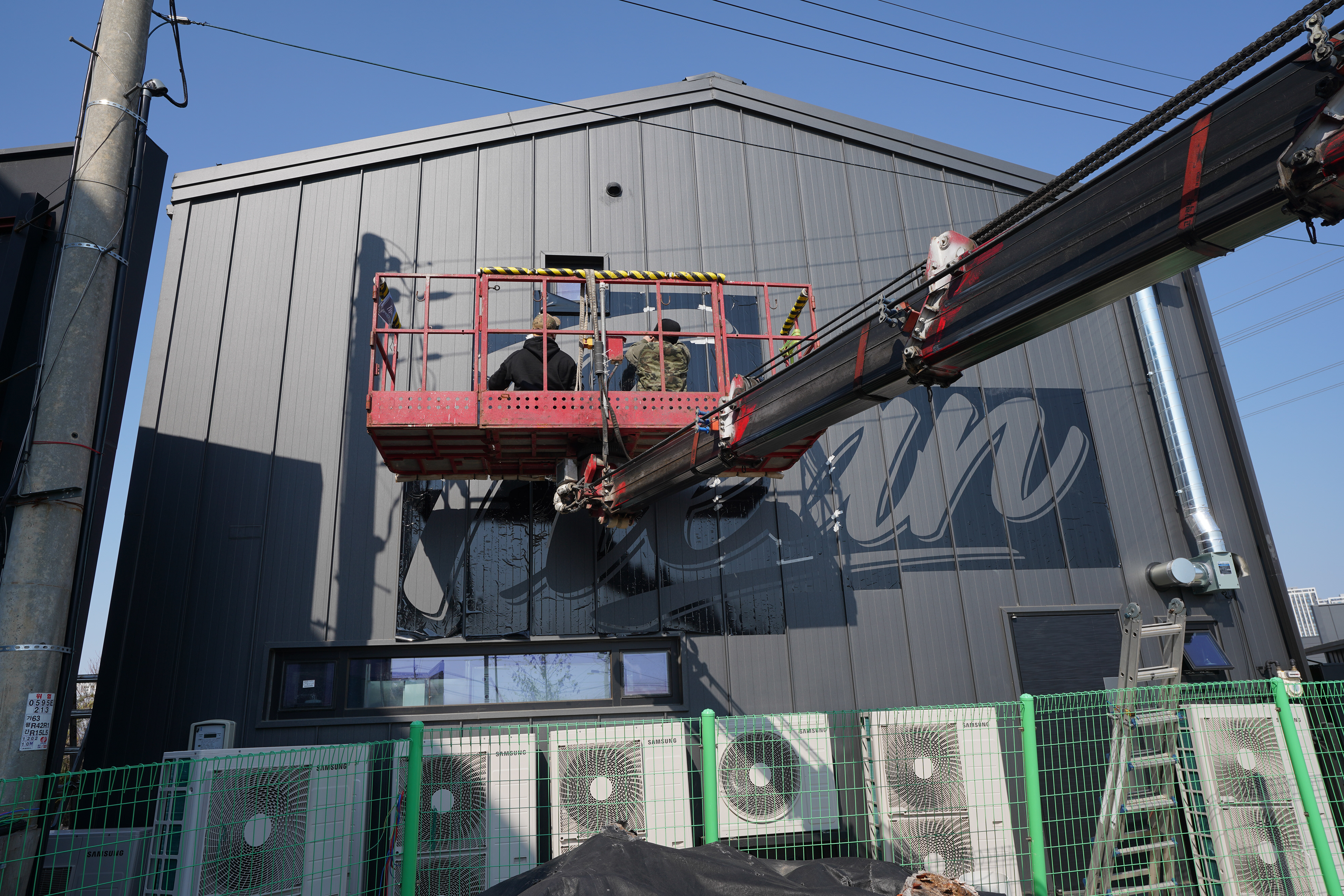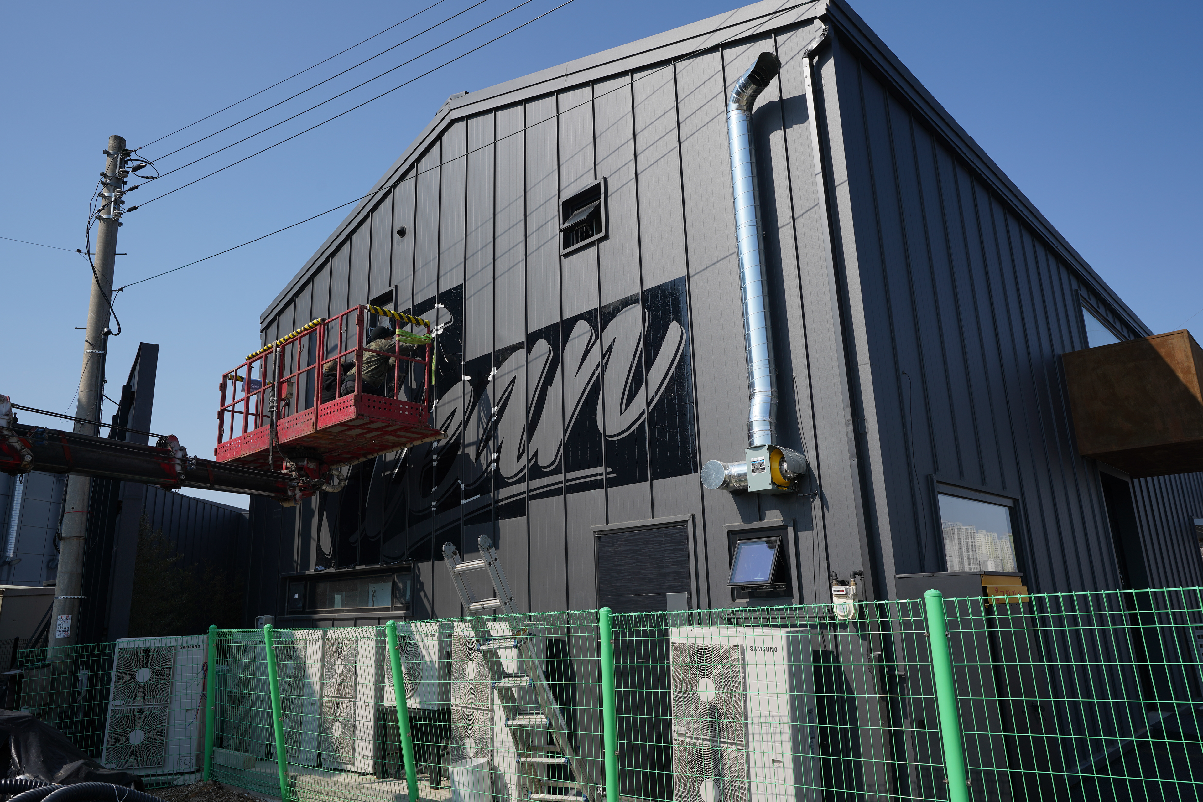 이번 프로젝트의 출발점은 장식적 벽화가 아니라, 외벽이 간판 역할을 대신할 수 있도록 만드는 것이었다. 클라이언트는 새 건물의 징크판넬 외벽 위에 프린팅된 것처럼 보이거나, 벽화처럼 크게 읽히는 레터링을 원했다. 즉, 이 작업은 단순한 시각적 포인트가 아니라 공간에 필요한 정보를 멀리서도 명확하게 전달하는 기능적 레터링이어야 했다.