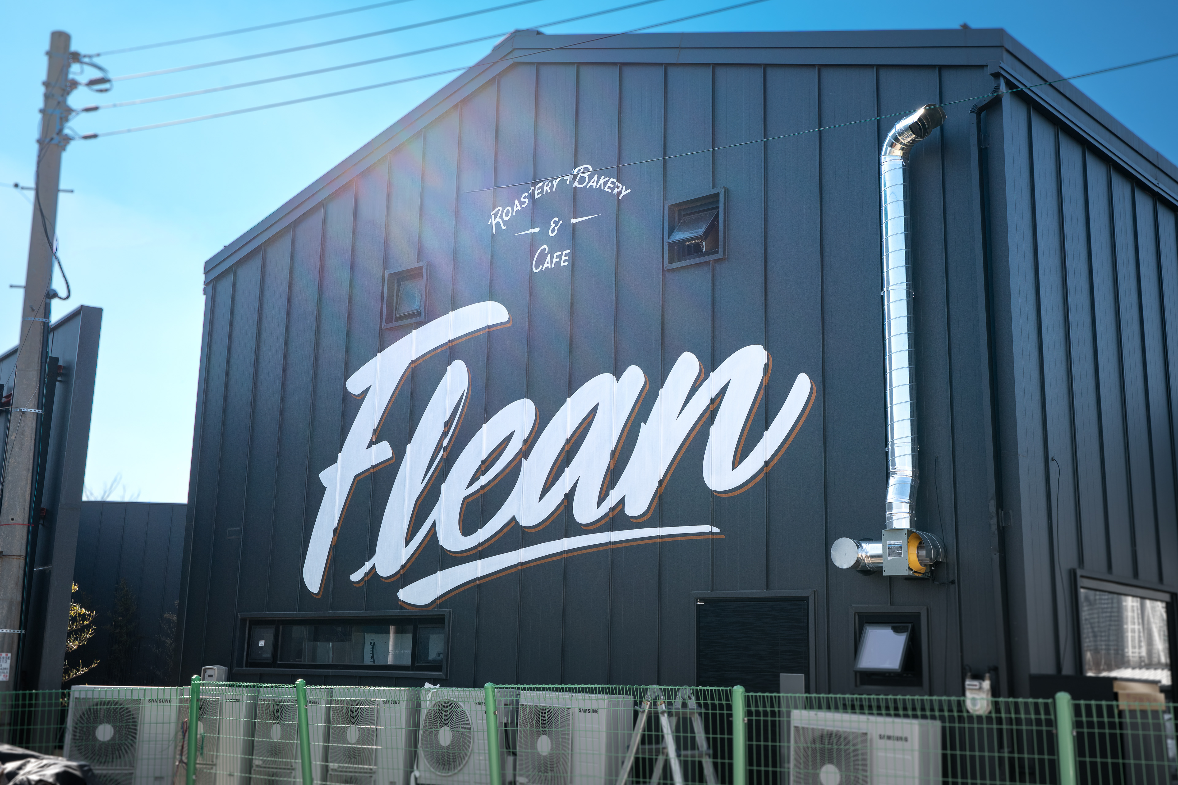 This project is a large-scale stencil lettering installation created for the exterior wall of Flean, a bakery and roastery café located in Jukbaek-dong, Pyeongtaek. Rather than installing a separate signboard, the project was planned to use the building façade itself as a readable sign surface visible from a distance. The full wall measures approximately 10m x 6m, and the actual lettering was designed and executed within an area of about 6m x 3m.