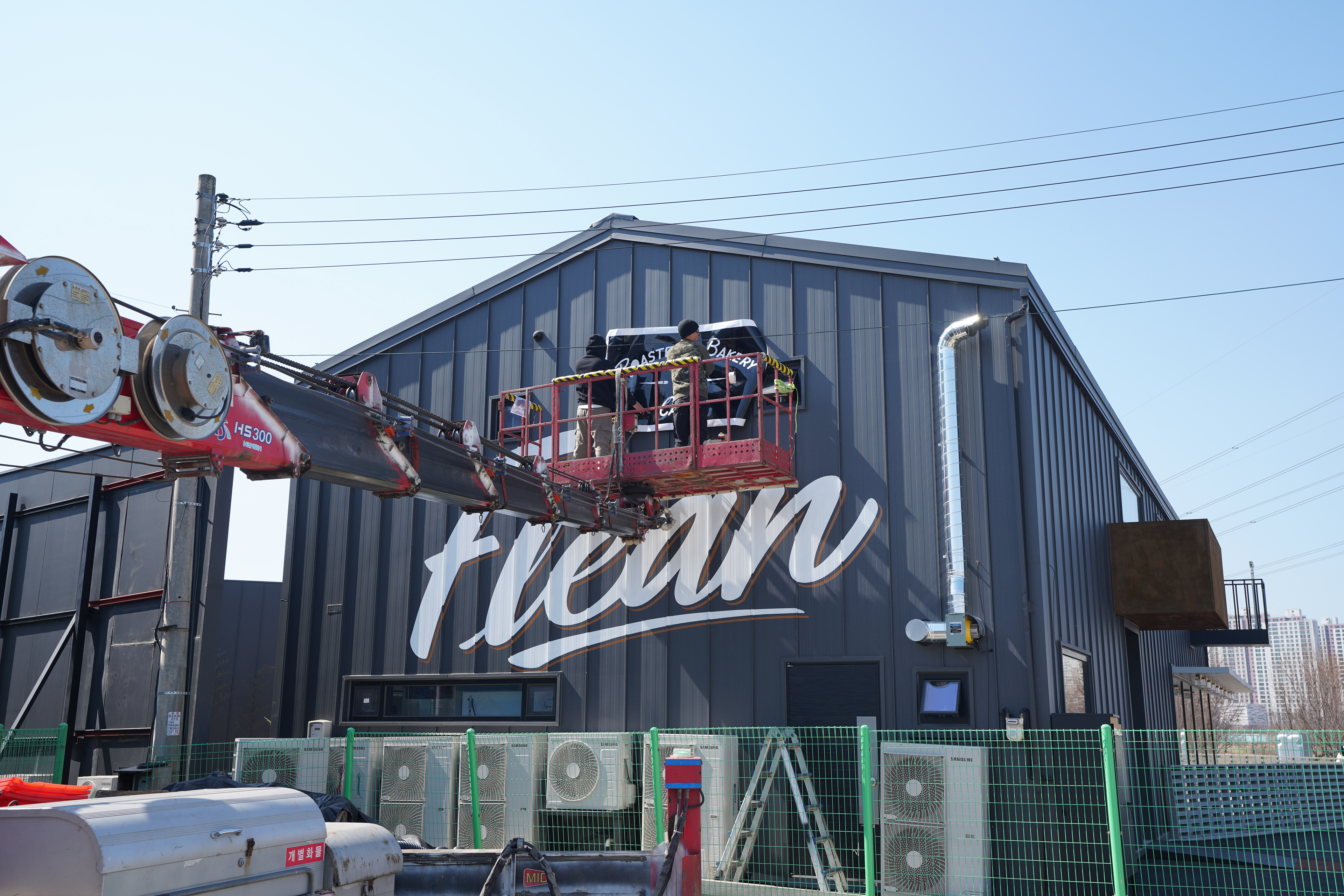 평택시 죽백동에 위치한 베이커리 로스팅 카페 Flean 외벽에 진행한 대형 스텐실 레터링 시공 프로젝트이다. 이번 작업은 별도의 간판을 설치하는 대신, 건물 외벽 자체를 멀리서도 읽히는 사인 면으로 활용하기 위해 기획되었다. 전체 벽면은 약 10m x 6m 규모이며, 실제 레터링은 약 6m x 3m 범위 안에서 계획·시공되었다.