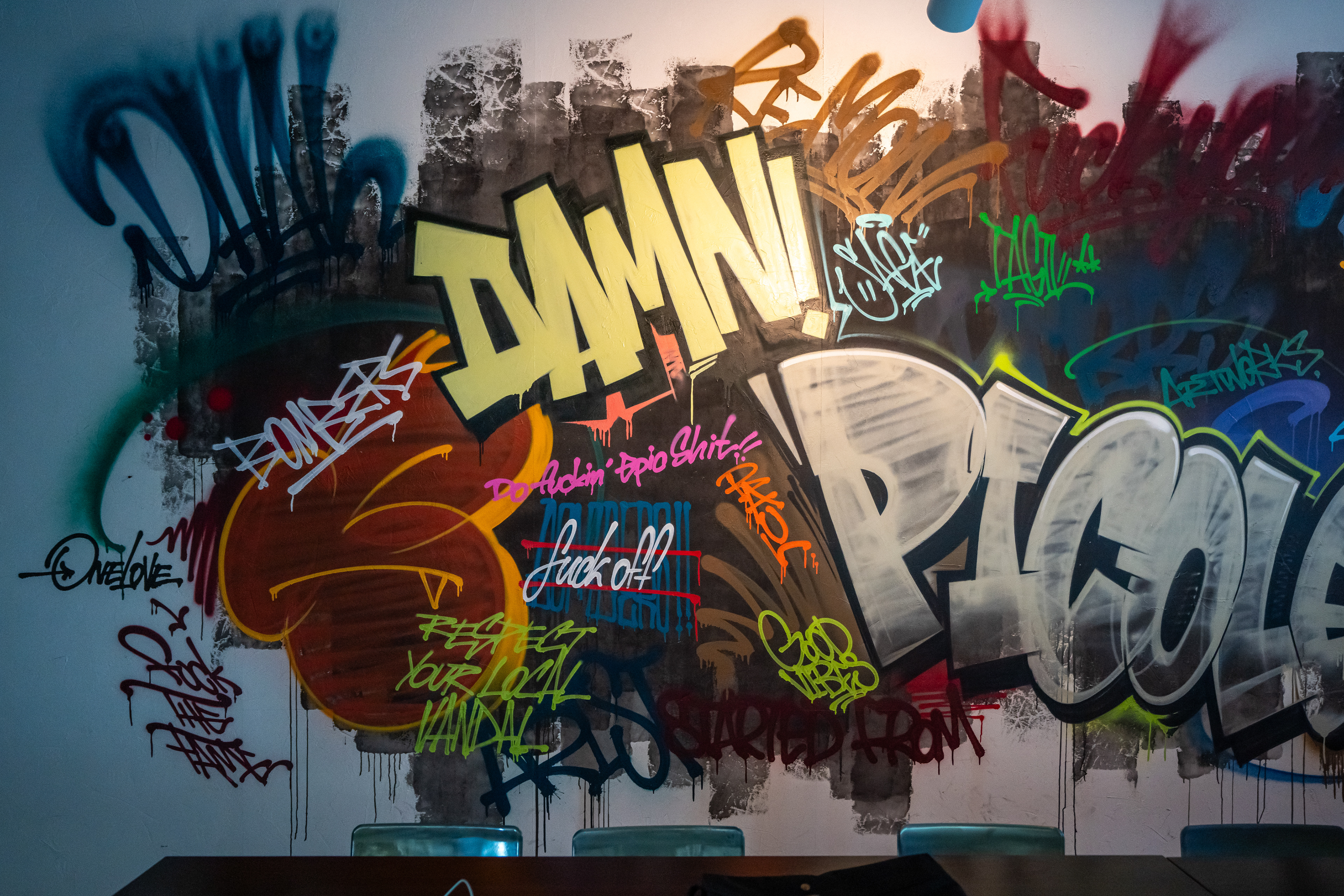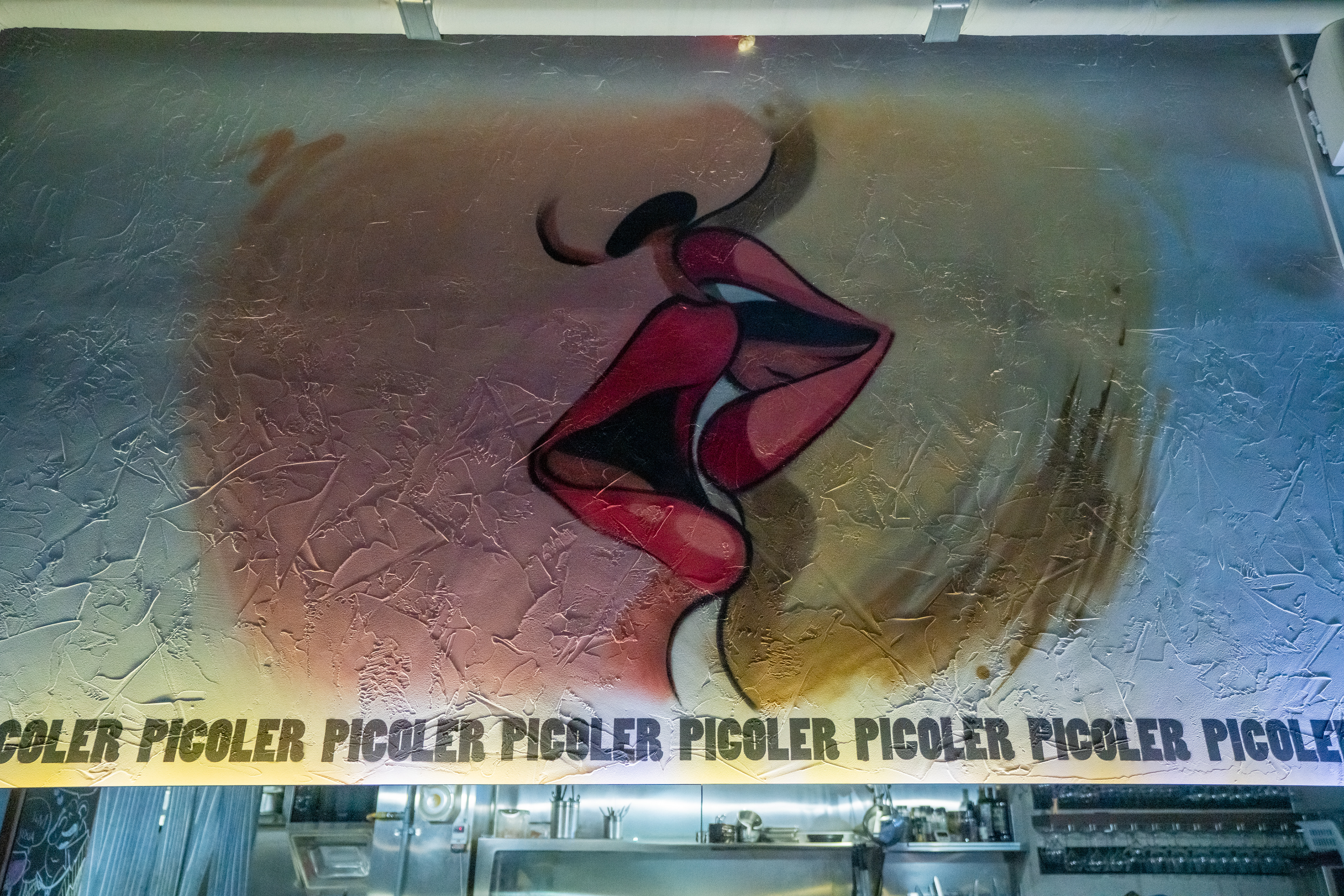 The collaboration began after the client discovered the artist’s graffiti work on Instagram. While PICOLER already had a polished interior, the space required a stronger visual identity. The core concept was “organized street energy”—bringing the raw atmosphere of back alleys indoors through deliberate, controlled graffiti layers rather than chaotic tagging.