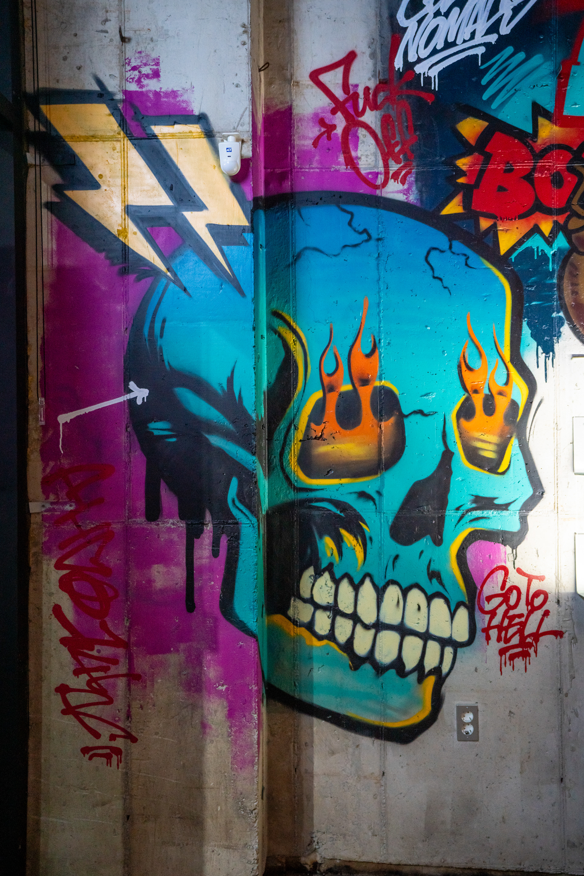 전 작업은 스프레이 그래피티 기법으로 진행되었으며, 기술적 난이도보다는 밀도 조절과 시각적 균형이 핵심이었다. 여러 요소가 겹쳐져 있음에도 벽면이 과도하게 혼잡해 보이지 않도록 색상 대비와 간격을 세밀하게 조정했다. 스트릿 특유의 거친 인상을 유지하면서도, 실내 공간에 어울리는 정제된 리듬을 만들어내는 데 집중했다.