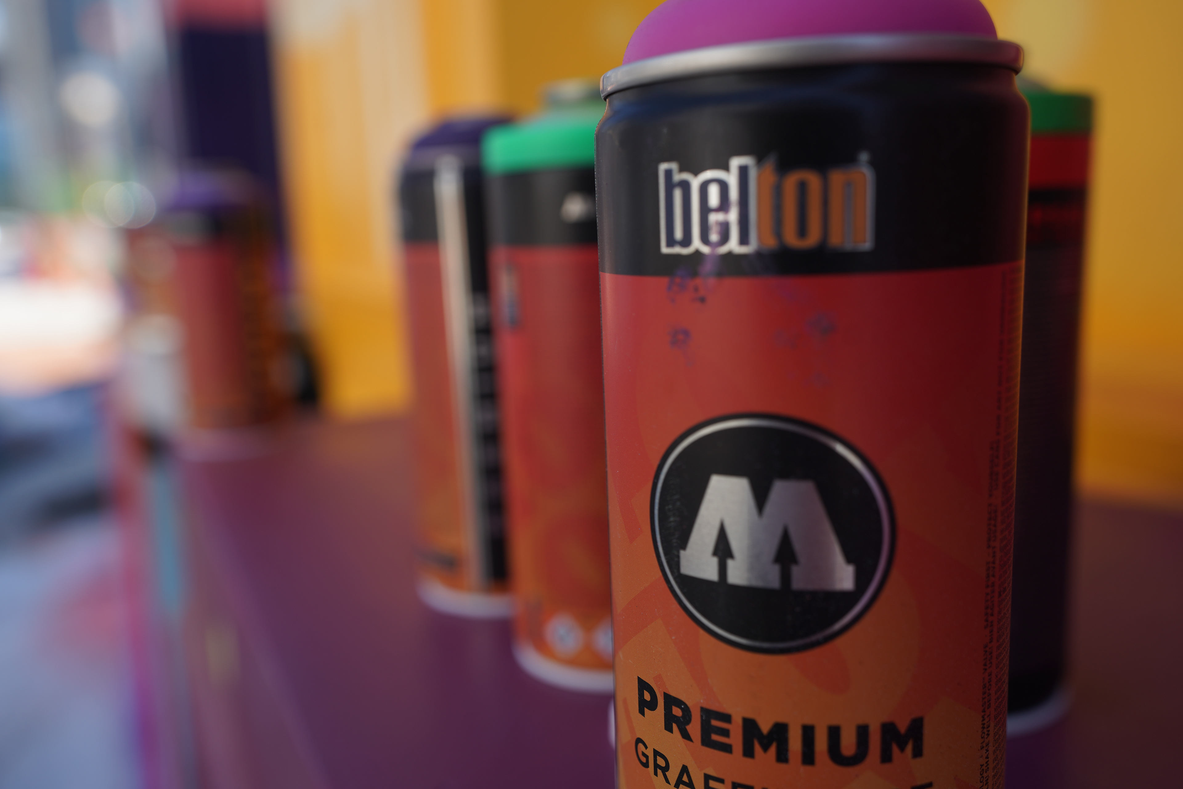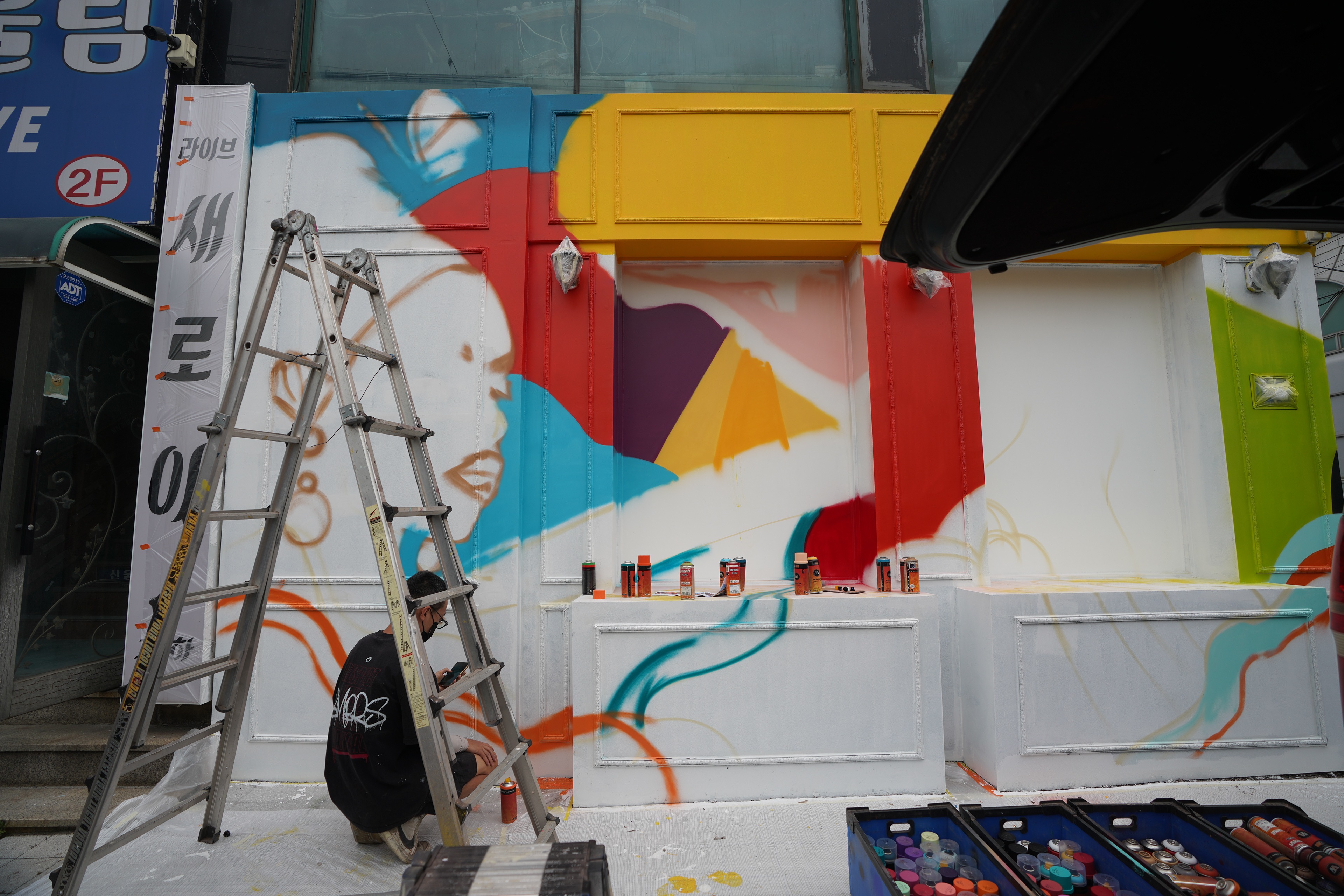 표면 정리 이후 외부용 수성 페인트로 바탕을 잡은 뒤, 그래피티 스프레이 작업을 진행했다.