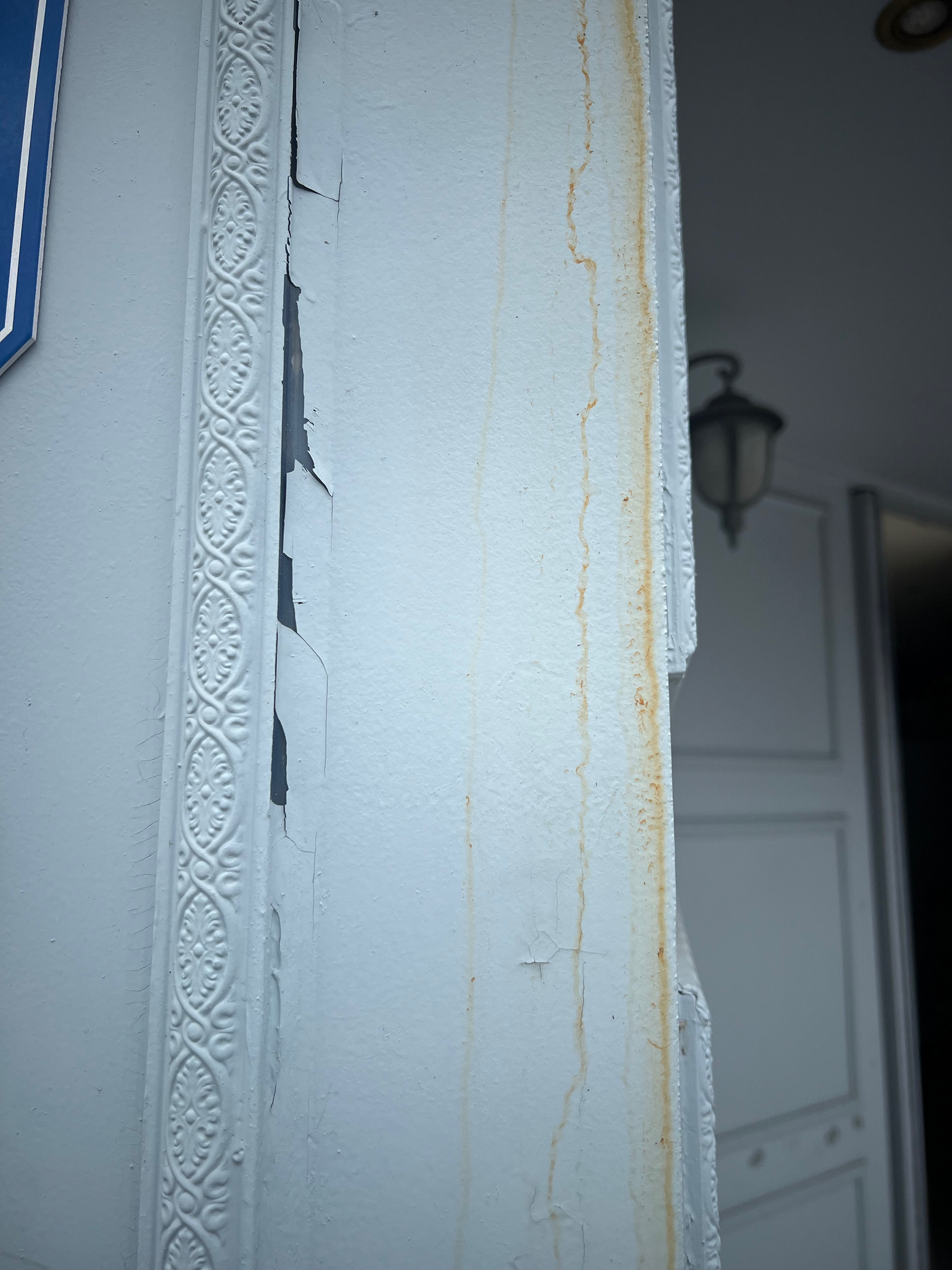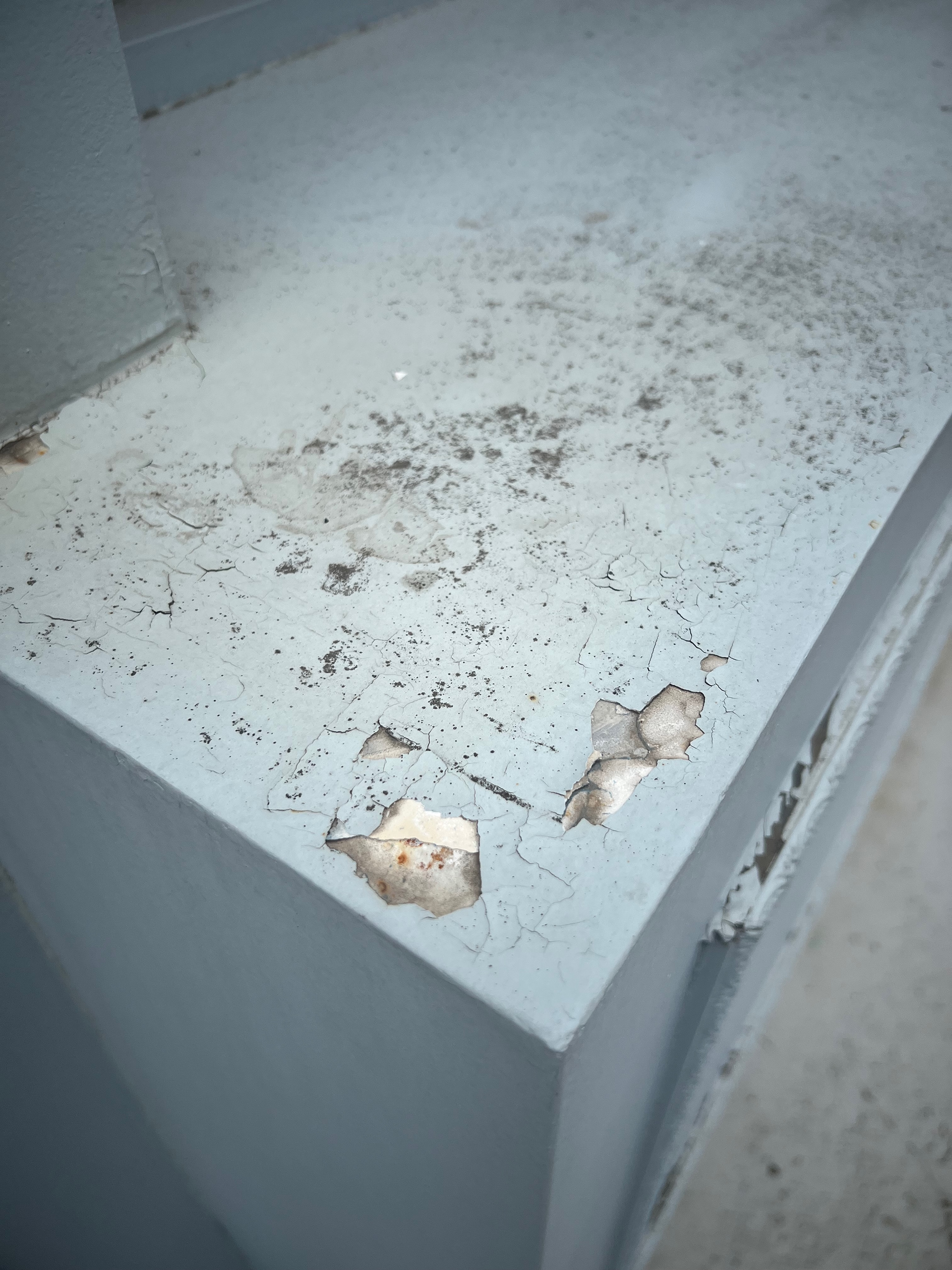 작업 전, 오래된 페인트와 탈거 흔적으로 인해 벽면 상태는 매우 불균일했다.