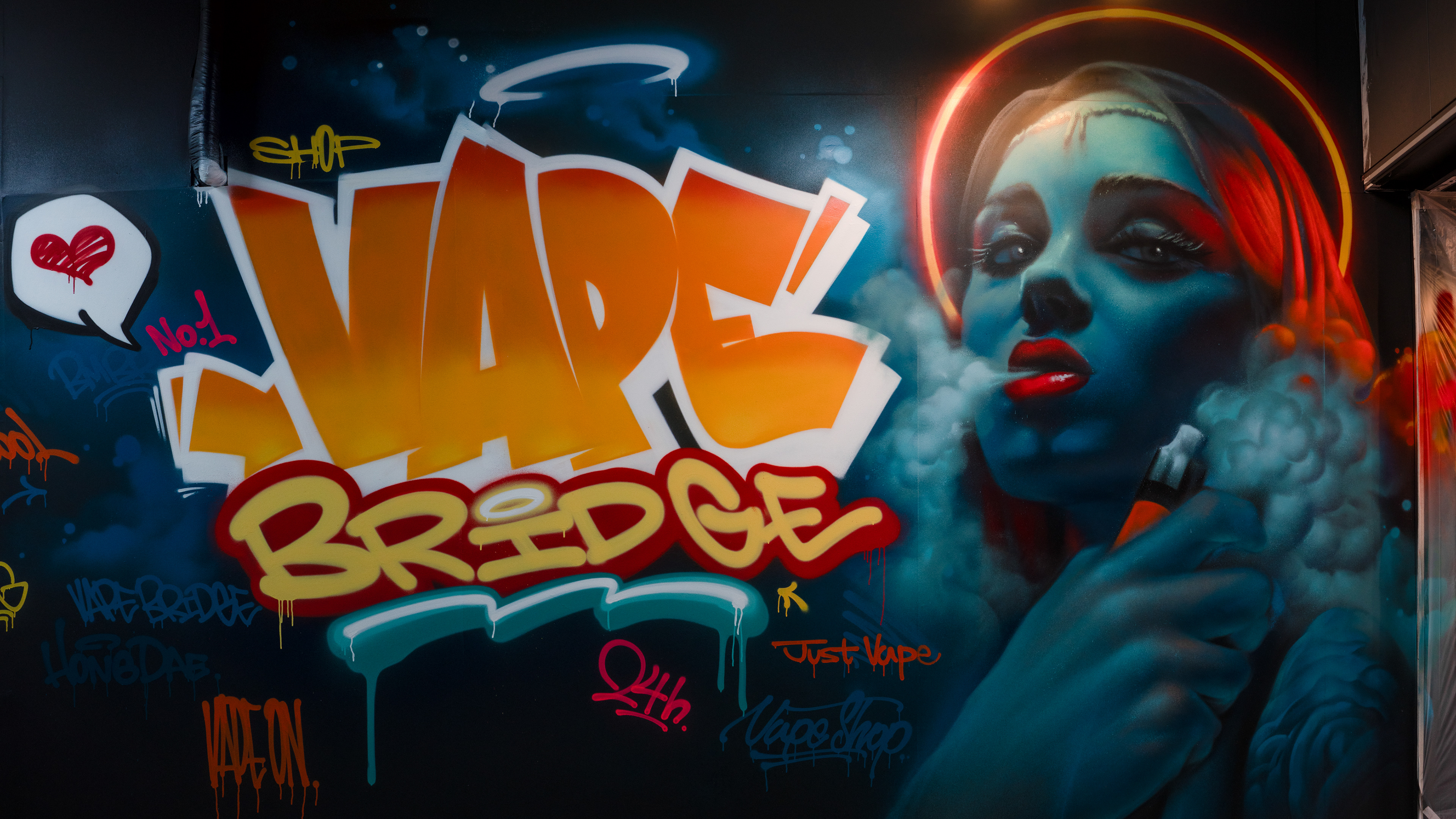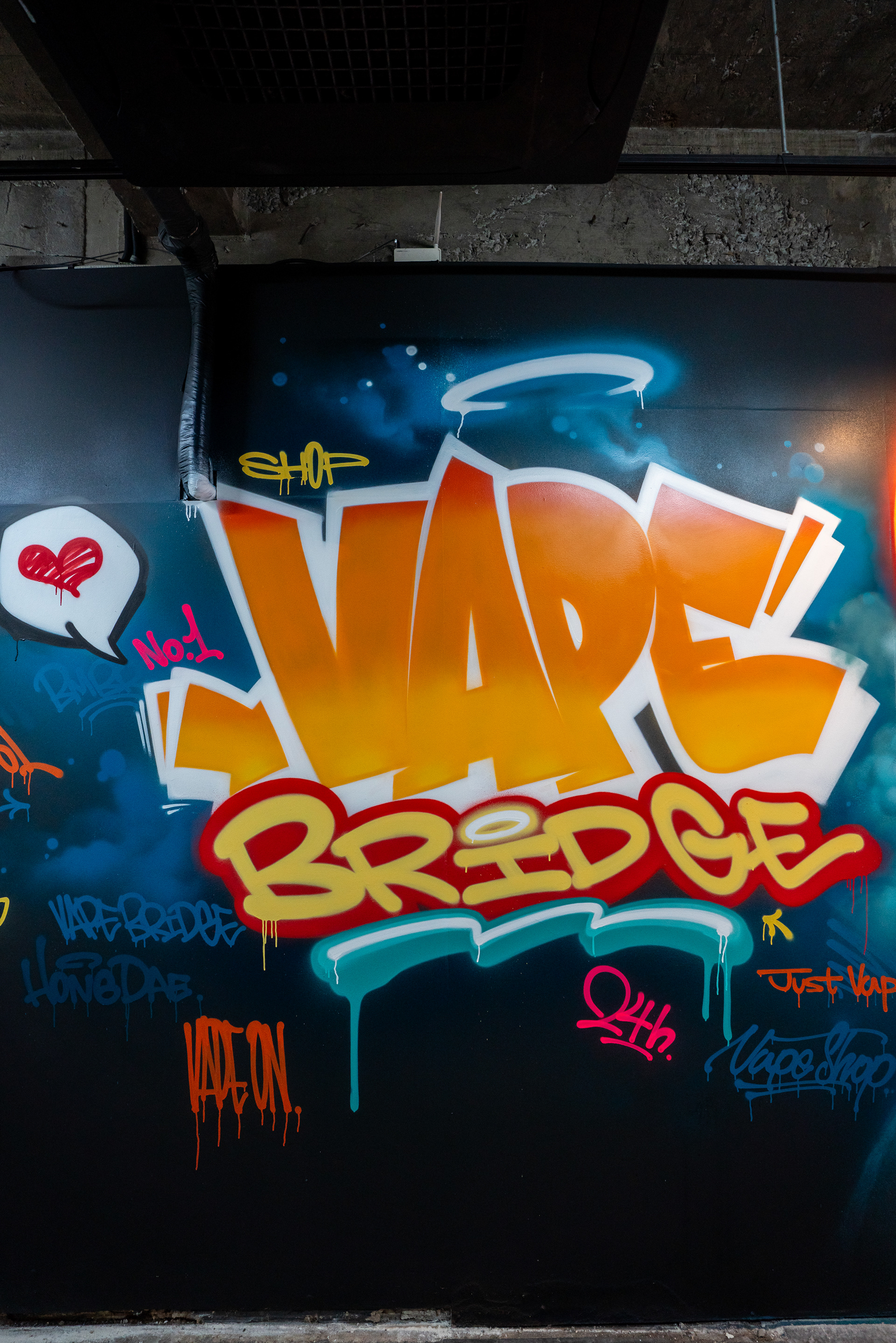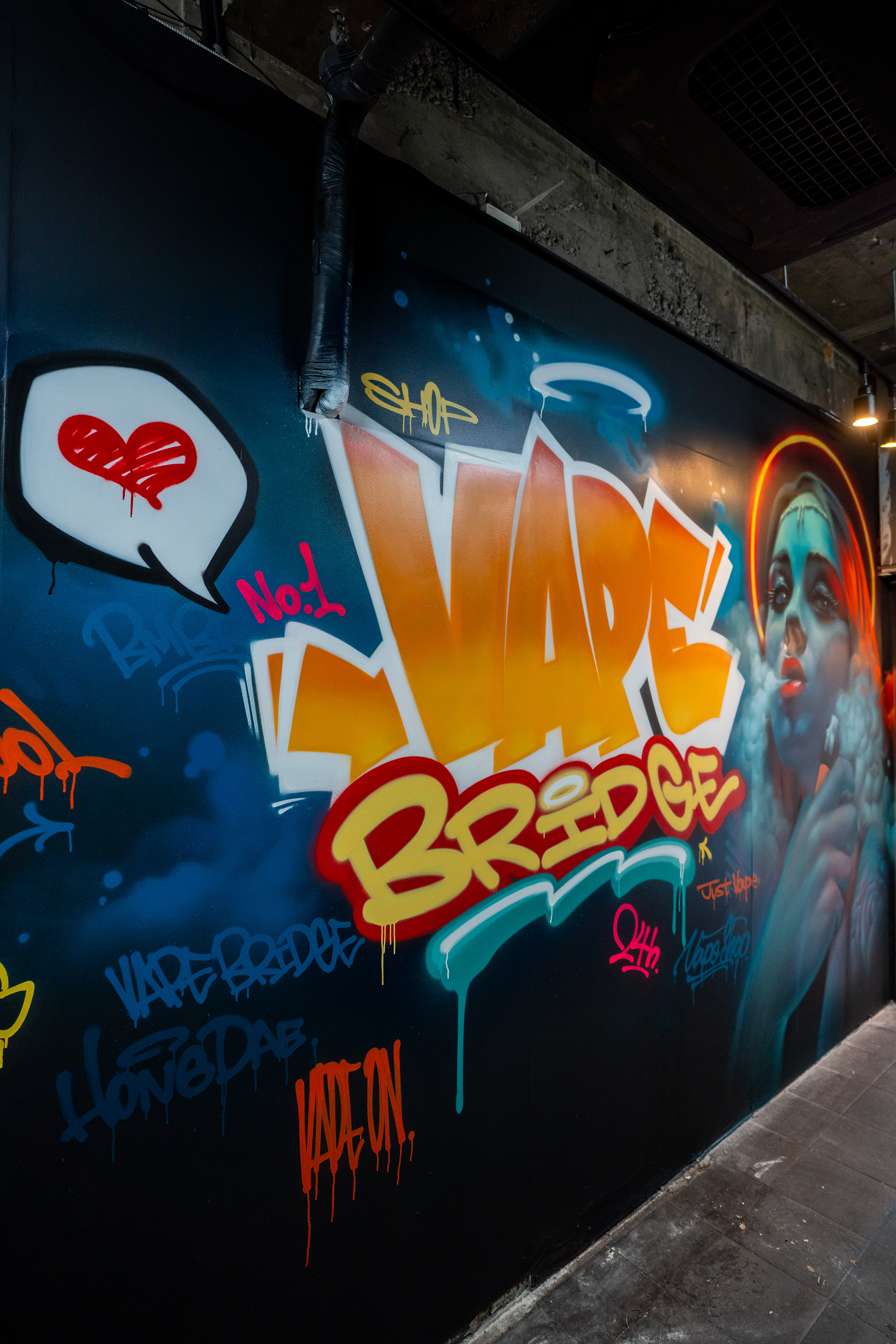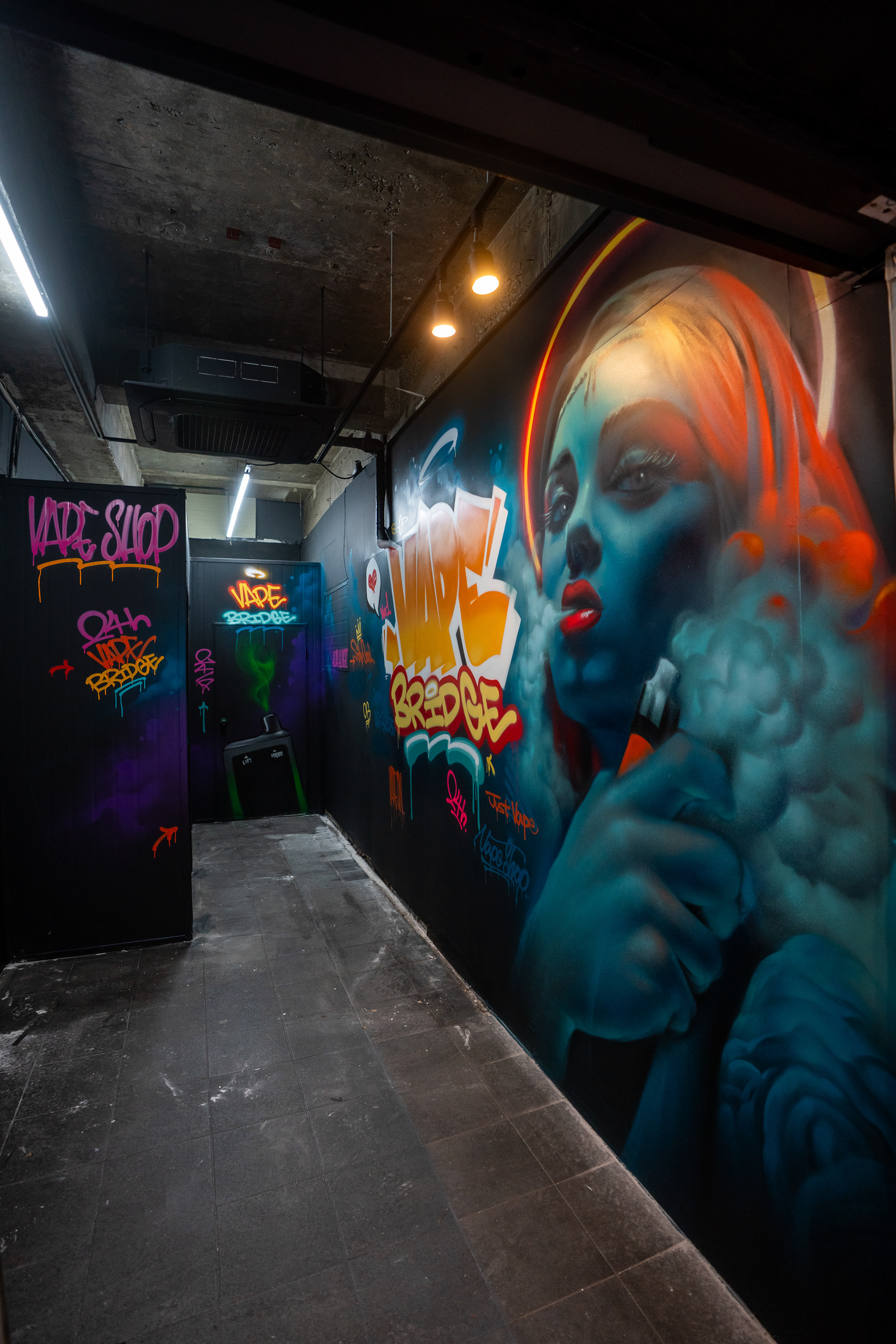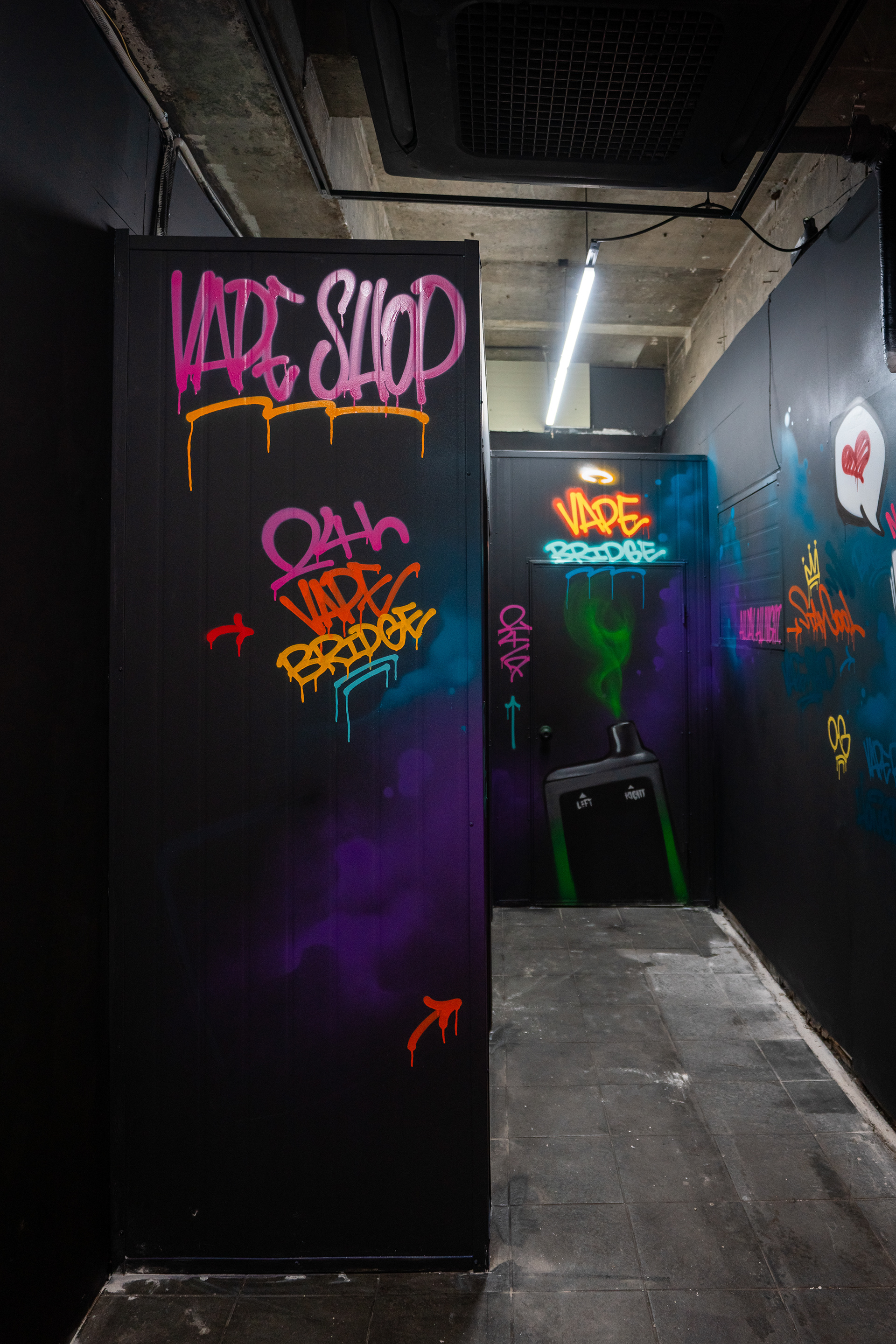 This decision led to a composition that treated the center and the surrounding surfaces with different levels of visual density. The main wall was built around a large VAPE BRIDGE lettering piece and a portrait, while tags, drips, symbols, and supporting letter elements were distributed across side walls, partitions, and the interior path to extend the viewer’s eye through the whole space. Rather than functioning as decorative additions, these elements were used as a visual strategy to make the shop feel larger and more dimensional than its actual size.