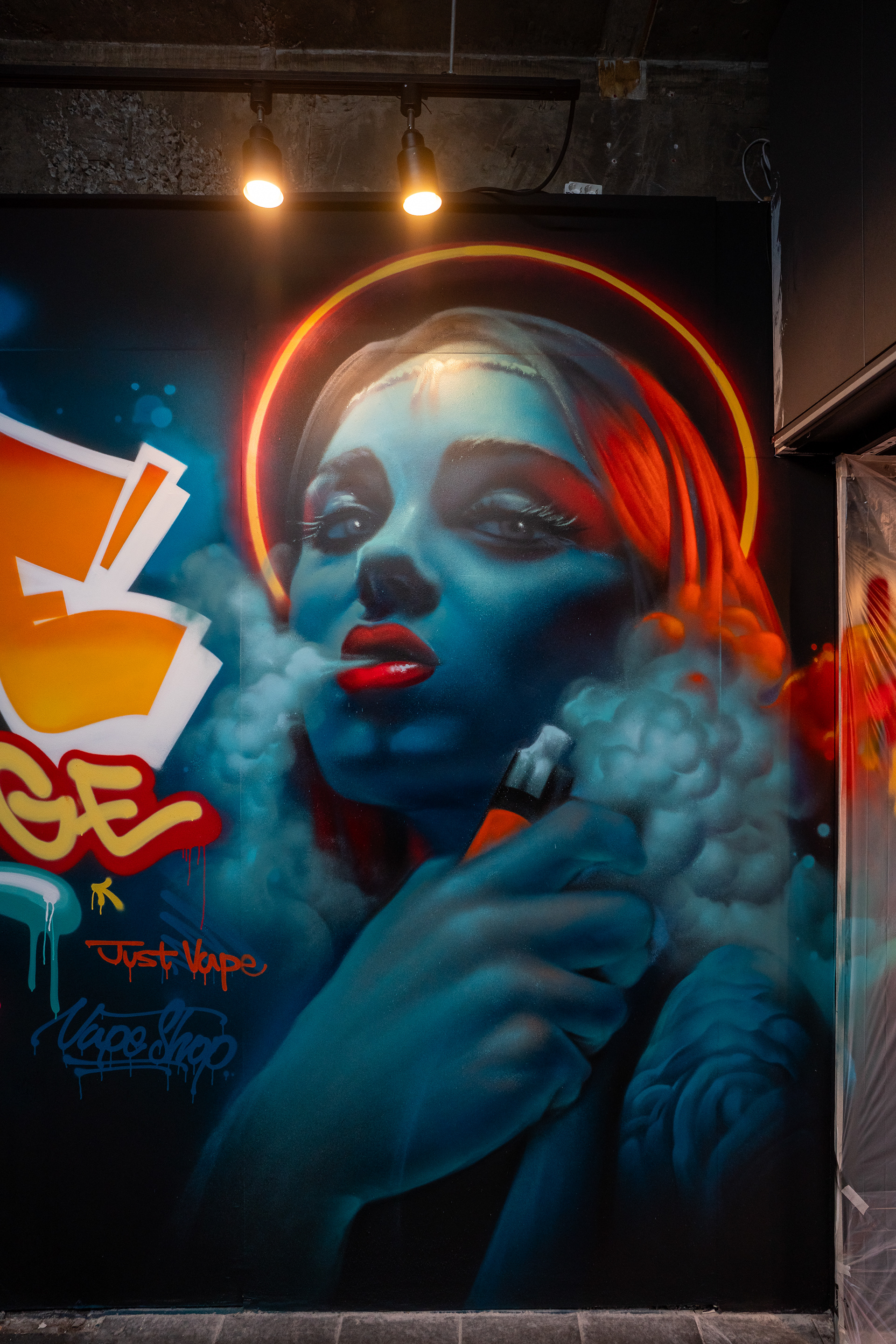 기술적으로는 배경 페인트와 스프레이를 병행해 작업했다. 넓은 바탕과 전체 톤은 페인트로 정리하고, 레터링, 태그, 인물 표현, 연기 효과, 하이라이트 등은 스프레이 중심으로 풀어내며 그래피티 특유의 속도감과 레이어를 살렸다. 특히 메인 벽면에서는 대형 레터, 인물 초상, 전자담배의 연기, 네온을 연상시키는 후광, 주변 태그가 함께 작동하도록 구성해, 단순한 제품 판매 공간을 넘어 장면성과 몰입감을 가진 내부 환경을 만들고자 했다.